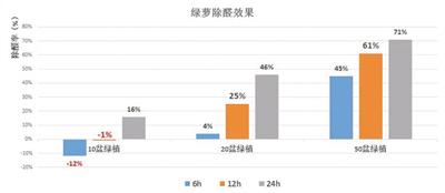 令人惊讶的是,20 盆泥土和 20 盆绿萝的除甲醛效果较为接近,24小时后,它们的除甲醛率分别为35%和46%,绿萝略胜一筹。